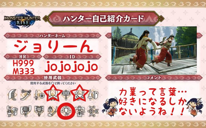 新しくアイコンを替えてギルカも更新 空条徐倫似のハンターが可愛い😆 時々相方と双子姉妹にもなります🤗 数年前モンハン知らない私が色々な方と出会えてSBやIBでのキャラのイラストも描いて貰えて嬉しい気持ちでいっぱいです😊 #モンハン #モンハン自己紹介カード #空条徐倫 #ジョジョの奇妙な冒険