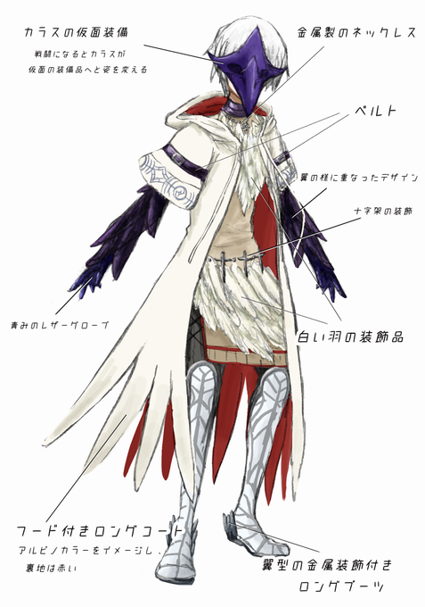白いカラスをイメージしました。中性的で少年っぽさが残った青年。レア装備アイテムの白いカラスは生きている様なモーションを見せ、それに合わせキャラクターもカラスに優しく触れたり等動きます。戦闘になると仮面へと姿を変えます。