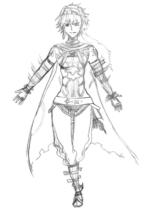 知的な好青年、身軽さをコンセプトにデザインしました。緑と拳術士と言う事で、彼女を思わせる眼帯、布の装飾を取り入れました。華麗に技を決めた後腰布とヘアバンドがふわりと舞います。落ち着いた色味の中にも和調のカッコ良さを出しました。