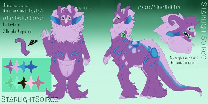 @SleepeaTea Im NB AFAB, my name is JINX and this is my sona JAM- they're an andalite, and were the first character I used to become comfortable with being autistic!