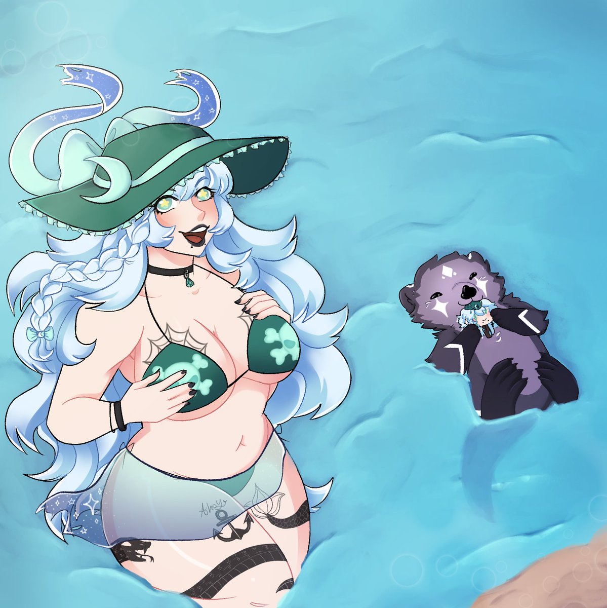 Even ghosts pirates and their otters can enjoy the beach! August is my month, Starlings! 💙🌊