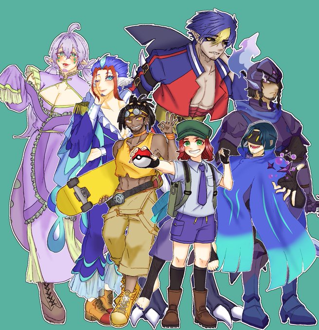 出来たー!🥳とりあえずチャンピオン戦までのパーティ擬人化(おじ化)+トレーナー #ポケモン #ポケモン擬人化 #擬人化 #デジタルイラスト