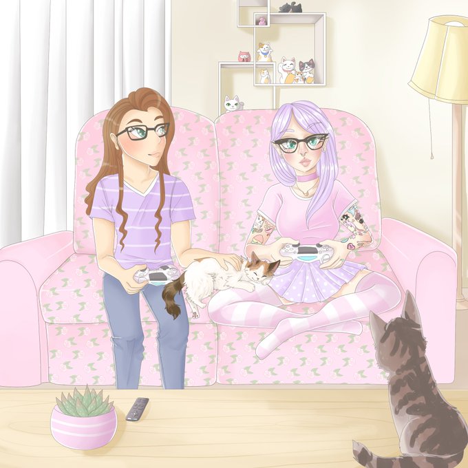 A piece I did for my husband while he was away!! It's us playing FFXIV with our cats 💖💞