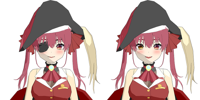 顔の調整に丸一日 ダミーテクスチャを張ってみると輪郭に違和感が。 顔の形状をこねくり回し、目のサイズやまつ毛を変えてみたりでようやくマリン船長らしくなった(_ _; )/~~ 「棒立ち素体+決めポーズ+顔」ここまでくれば一安心