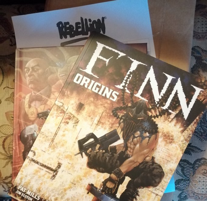 Admiring these GORGEOUS hard -and paperback contributor copies (received by one of the collaborators) of the anniversary edition of @PatMillsComics' iconic Finn series, courtesy of the ever excellent @Rebellion Publishing.