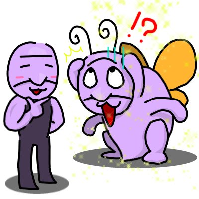 #青鬼真剣お絵描き1週間一本勝負 お題「蝶」 スクワット鬼「…珍しいな。コスプレか?」 クモ鬼「違うよ!急に生えてきたんだよ!」 スクワット鬼「…似合ってるぞ😏」 クモ鬼「嘘 や ろ😱ああぁ、どうしよう」 スクワット鬼「…ここで一句」 クモ鬼「 な ん で や ね ん」