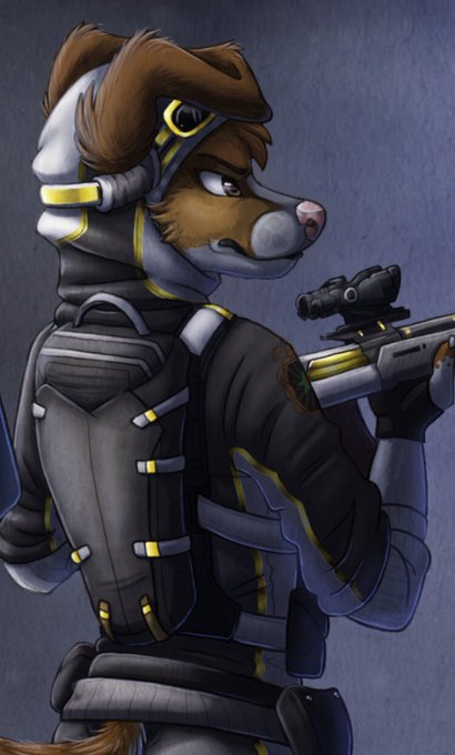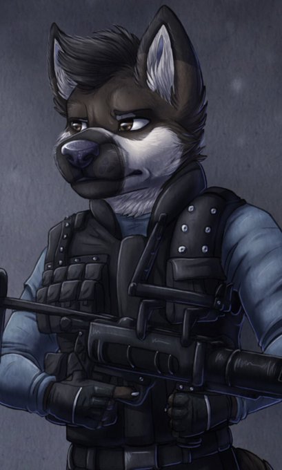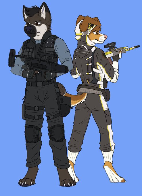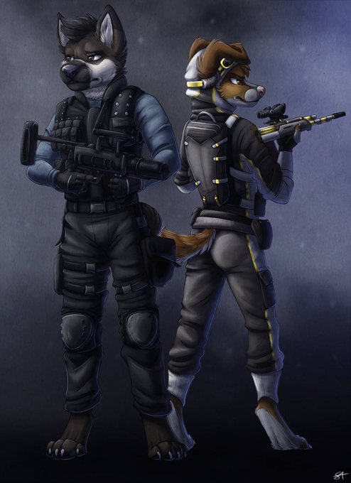 A drawing a recently finished of mine and my bf’s fursonas dressed up as operators from Rainbow Six Siege. Aries is Nomad and Bryan is Ash.