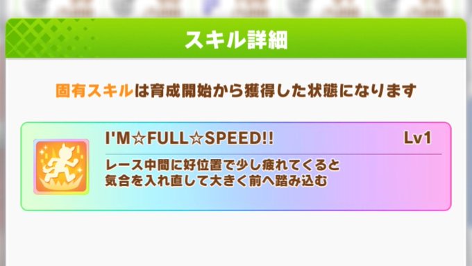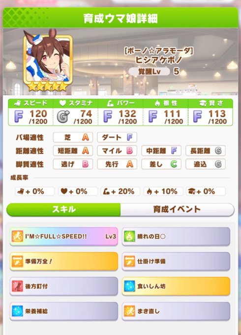 ヒシアケボノ 久しぶりの短距離キャラだが成長率がパワー20%、根性10%とやや残念 固有スキルも中間で好位置かつスタミナが一定減っていることが条件なので、短距離だと樫本入れてスタミナが増えてる場合発動しないかも 逃げに継承させて中盤の追い越し用かな ちょっと微妙なキャラ