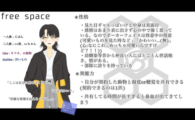 @C_H_TL 実は2人目出そうかなと考えています💭 「ツンデレキャラ」です( ̄^ ̄*) 名前 尖崎 甘楽(このさき かんら) 部隊→救護部隊 能力→注射医療(バカでかい注射器で対象のダメージを採取し回復させる、それを敵に注射してダメージを与える) #C_H_キャラ案
