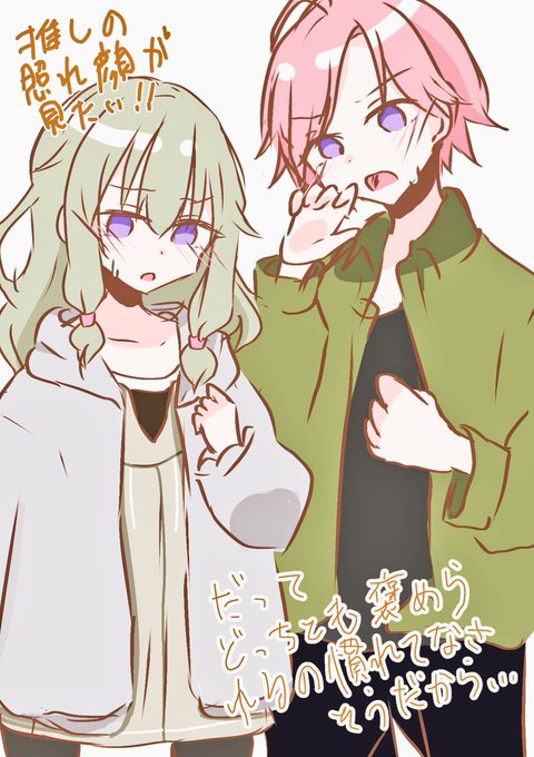 推しの照れ顔って可愛いよね…… 描いてる時に気づいたけど、これどっちとも目の色が紫なんだよ 可愛i......(((