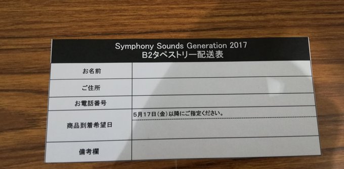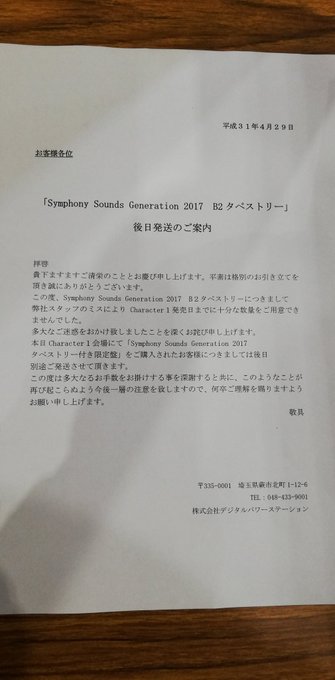 character1にて販売予定の「Sympohy Sounds Generation 2017 タペストリー付き限定盤」につきまして、製造会社様のミスによりタペストリーの搬入数が予定数よりも大幅に少なくなってしまいました。