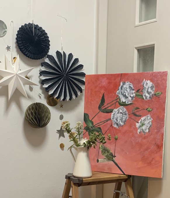 黄色い小鳥に勇気と元気を与えてくれる、二本のガーベラ。小鳥はどこに飛び立つのでしょう。