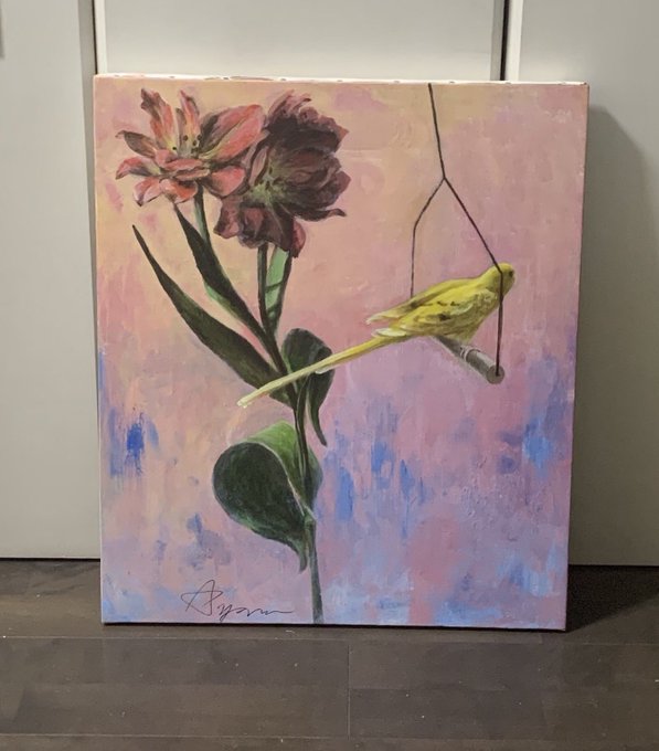 黄色い小鳥に勇気と元気を与えてくれる、二本のガーベラ。小鳥はどこに飛び立つのでしょう。