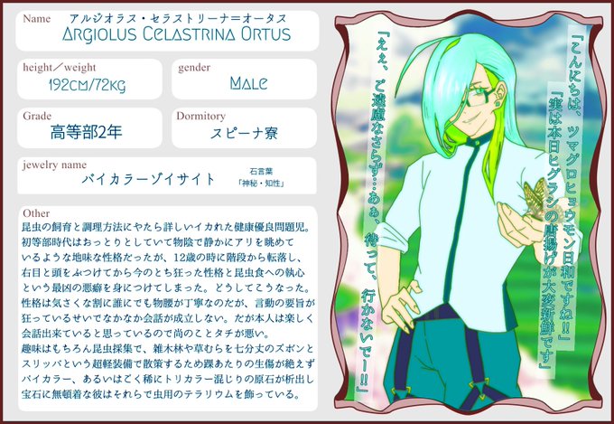 @juweel_ar ノクのパートナー兼同室が色々あって実質解消になってしまったので、そのうち作ってうちうち組むと思います…という感じの子のイメージ……100年以上前から生きてる精霊族、お役目が嫌で人間社会に逃げ出した子……ギャルっぽい見た目のくせに委員長気質のツンデレ。