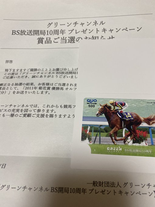 帰ってきたからグリーンチャンネルのQUOカード当選してたよ🎉グリーンチャンネルは競馬番組ね🏇俺の好きなオルフェのカードめちゃくちゃ嬉しい😂😂