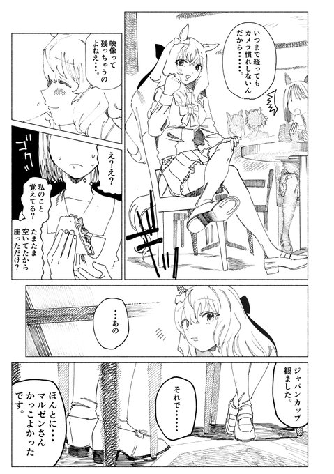 チヨノオーさんの育成シナリオをやってマルゼンお姉さま!!!!!!!!!!となり、描いた漫画です。モブウマ娘目線のマルゼンさんとチヨノオーさんです。未プレイの方はピンと来ないかもしれない内容です!!!注意してください!!!!!