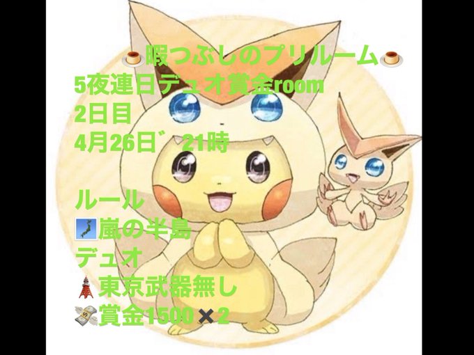 🍮暇つぶしのプリルーム🍮 5夜連日デュオ賞金ルーム 3日目! 日時 ゛4月27日 21時 一般枠 20時59 🗾嵐の半島 🗼東京武器無し 💰賞金 1500×2 選択可 参加条件全員 @TGPuri @xshaluuuu_46 この2人をFollow and RT 交換枠は、▶️@TGPuriまで!🍮 #デュオゲリラ #4月27日 #21時