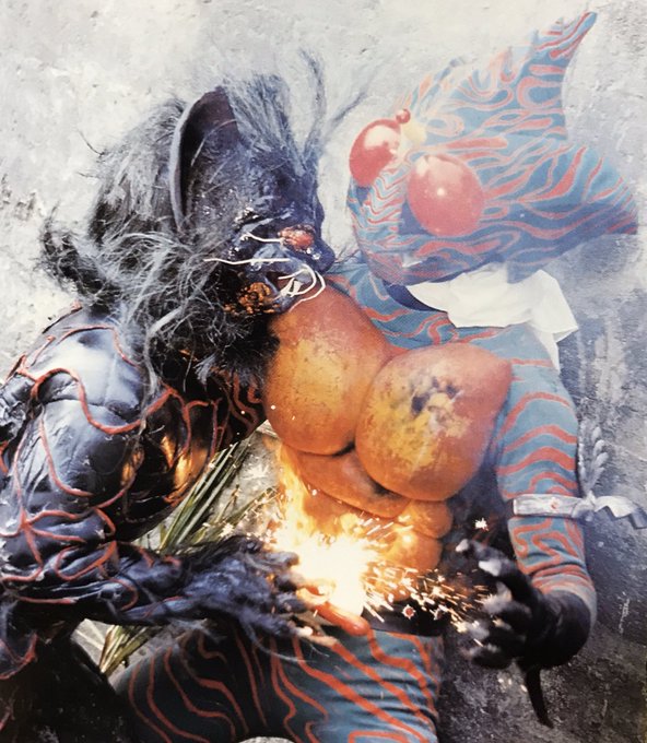 1974年 5月22日に行われた新キャラクター 悪人軍団撮影会より…生田スタジオ第2ステージ内に組まれたキングダーク…当日は眼や口の開閉といったキングダークの基本ギミックも披露されたとの事…巨大感を演出すべく大野剣友会 武田秀年さんがキングダークの犠牲となっている… #仮面ライダーX