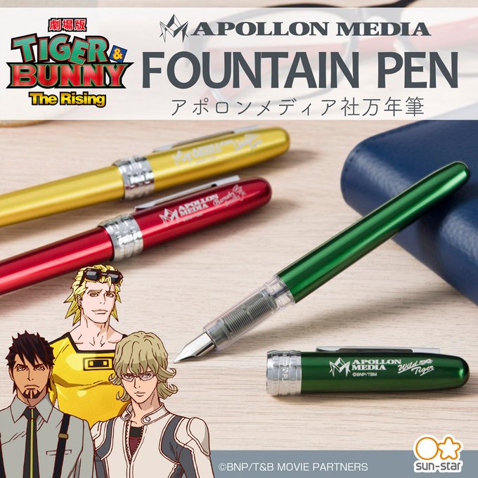 「TIGER & BUNNY」の万年筆が登場!アポロンメディア社のロゴと所属する3人のヒーロをサイン風にデザイン。普段使いに活躍する使いやすい万年筆です。予約受付は10月25日(金)23時まで。#tigerbunny https://t.co/LzBHdz3fOM