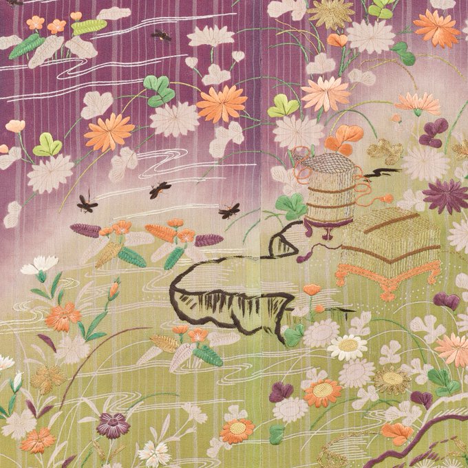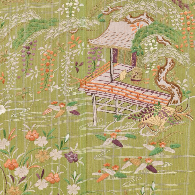 Kimono with Flowing Water, Plants, Pavilions, and Insect Cages, 19th century