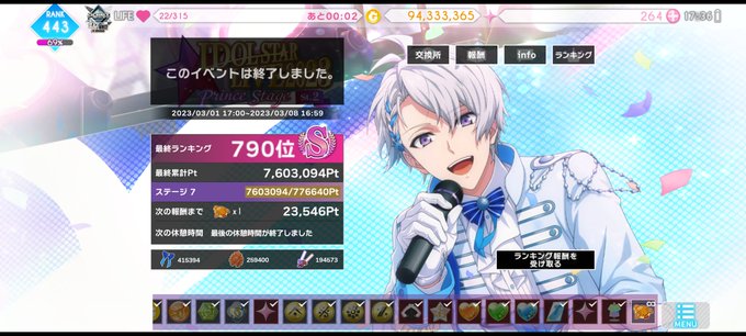 アイライイベst.2お疲れ様でしたー!Sキープ出来たけどもう少し頑張りたかった〜!本当に本当にアンコール来なさすぎて💦💦でもナナコレ有難う🙏✨王子様の微笑みじゃん🤦🏻♀️💜✨