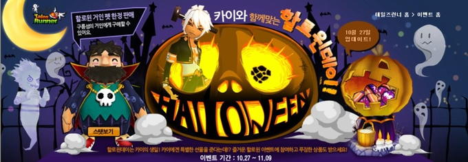 테일즈런너 할로윈 관련 이미지입니다 테일즈런너에서 해마다 캐릭터,아이템,팜아이템을 세일하거나 패키지형식으로 파는 등 다양하게 팔았습니다. 인게임에서 할 수 있는 이벤트들을 크게 열어서 재미있던 이벤트 중 하나였습니다.