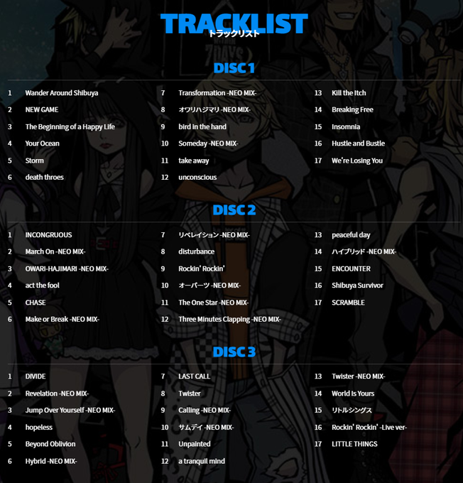 Desvelada la lista de temas de la banda sonora de NEO The World Ends With You. Incluye 51 temas, 17 de ellos nuevas versiones de temas anteriores y 34 completamente nuevos.
