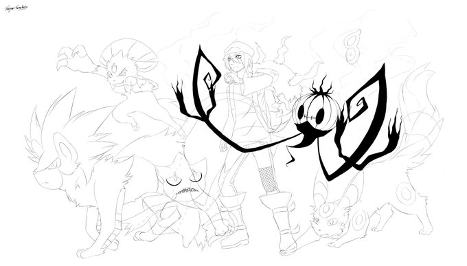 Step-by-step process from my most recent drawing of my pokemon OC with their team
