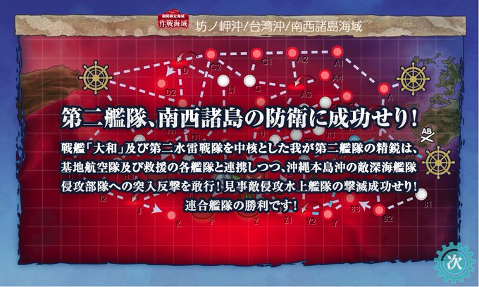 やったー、やりました(疲 友軍艦隊終了後5択だったのでダメだと思ったら、 矢矧、朝霜、北上(中破)の3連続カットインが入って勝てました。 アドバイスくださったフォロワーさん有難うございます。
