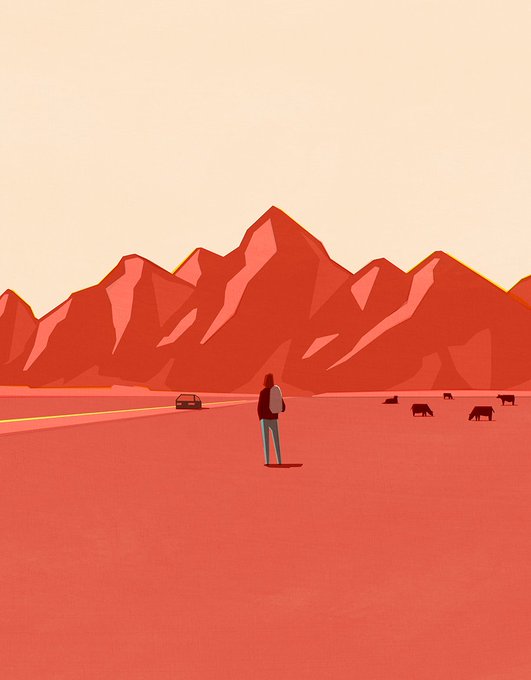 The New Yorkerコラム“Courage” (By Daniel Smith)扉絵です。夕暮れのワイオミングの大地に降り立った女性を描きました。