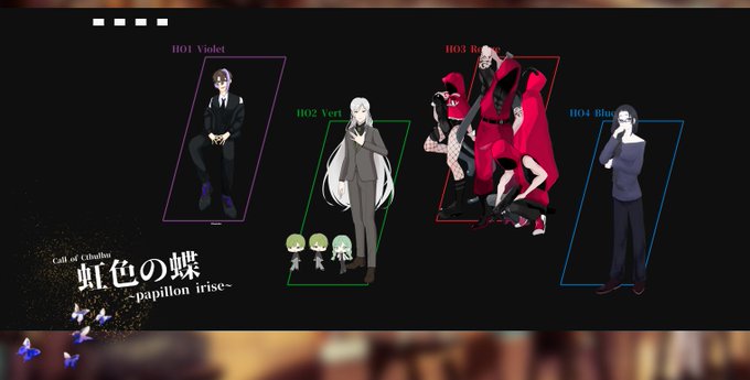 CoCシナリオ『虹色の蝶~papillon irise~』緋月様作 KP:如月沙夜 HO1/紫:お茶漬け/John・Smith HO2/緑:大橋/Cole Irving HO3/赤:とるてぃーや石橋/Jake ・Doe HO4/青:流血職人/Elijah・Lopez #お茶の卓報告 パピヨン~!!!!!!皆殺します