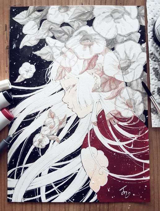 Little tribute to the Heike Monogatari anime, inspired by the beautiful visuals of the ED 💮 Indian ink, markers, coloring pencil and a splash of white paint :) ✒ #平家物語 #traditionalart