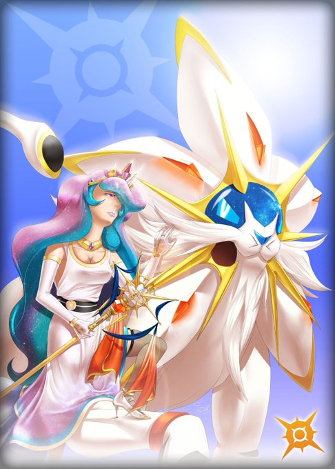 Human Princess Celestia and Princess Luna with the Legendary Pokemon Solgaleo and Lunala.