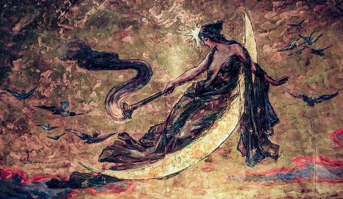 #FolkloreThursday Nyx is the Greek goddess of the night. Nyx stood at or near the beginning of creation and mothered other personified deities such as Hypnos (Sleep) and Thanatos (Death),with Erebus (Darkness).Her appearances reveal her as a figure of exceptional power and beauty