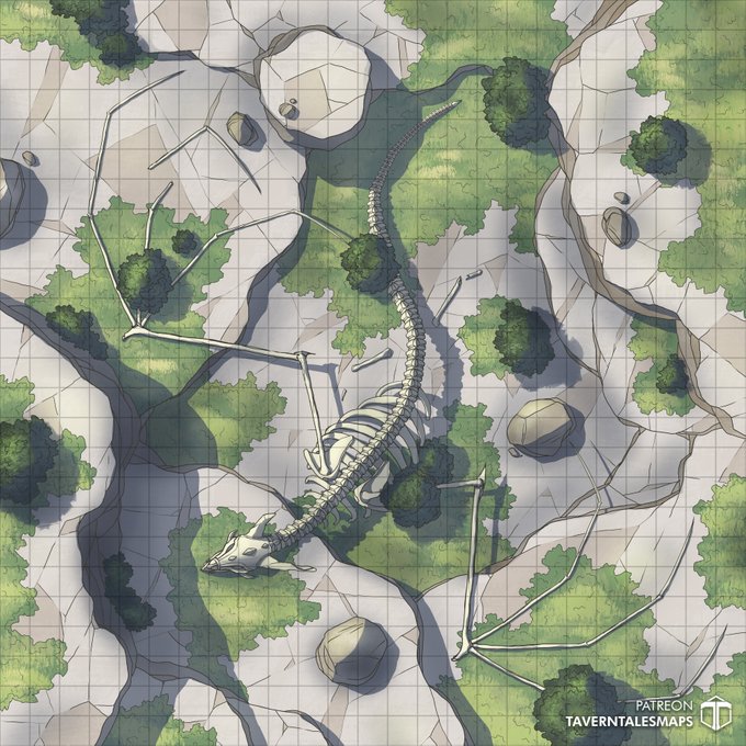 New #ttrpg/#dnd map release, Cliffside Dragon Remains. Lot of elevation in this one. Are people looting the remains? Can the dragon be re-animated? Hope you like it! Find more free stuff at our patreon.