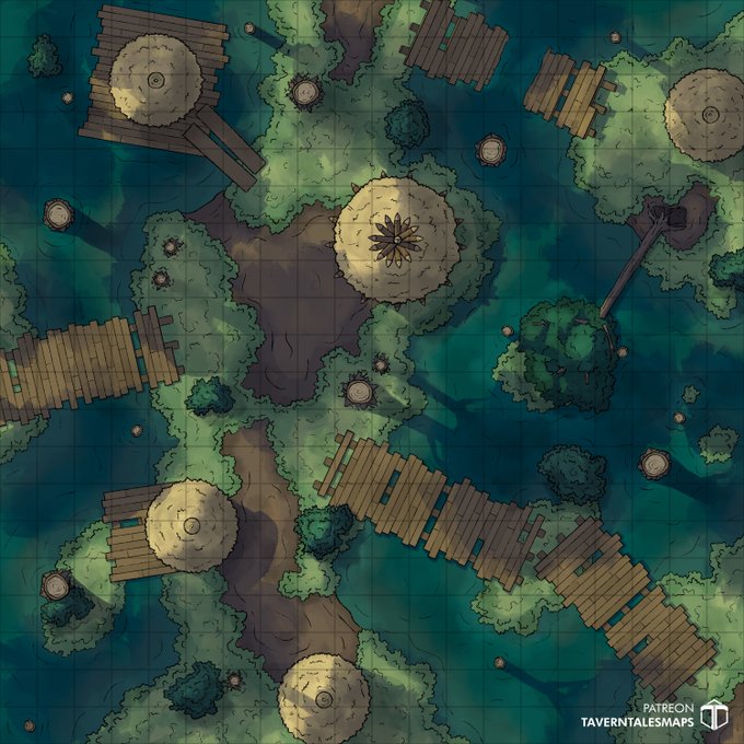 yo its a new #dnd/#ttrpg map and we like it a lot - the Swamp Village. Hope you do too (seems like people never have enough swamp maps). Can always find more free map versions on our Patreon. Cheers 🍻