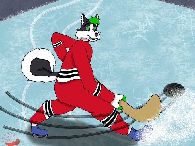 Some art I did for @FonixHusky! He tweeted about wanting his sona in a blackhawks jersey, sooooo I made that become a reality!