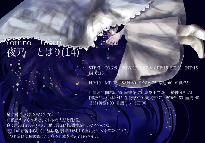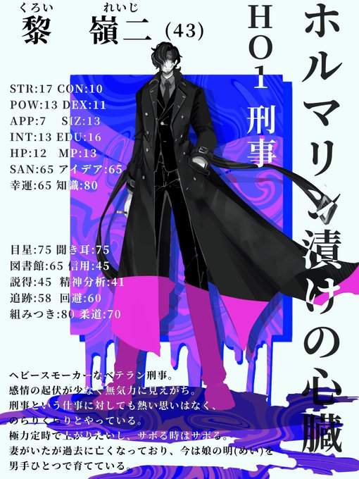若干癖毛気味な黒髪と隈と気怠げな目と血色が悪めな肌。STRが17あるので実は体は鍛えられてる。顎とかしっかりしてて髭もあるので男性って感じの顔立ちかな…