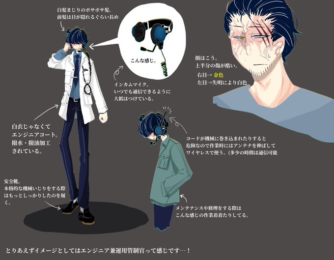 メカクレとヘッドホンとエンジニアコートででまぁ顔の傷以外はよくいそうな機関のくたびれたおじさん職員、といった印象。顔も普通of普通のジャパニーズ。