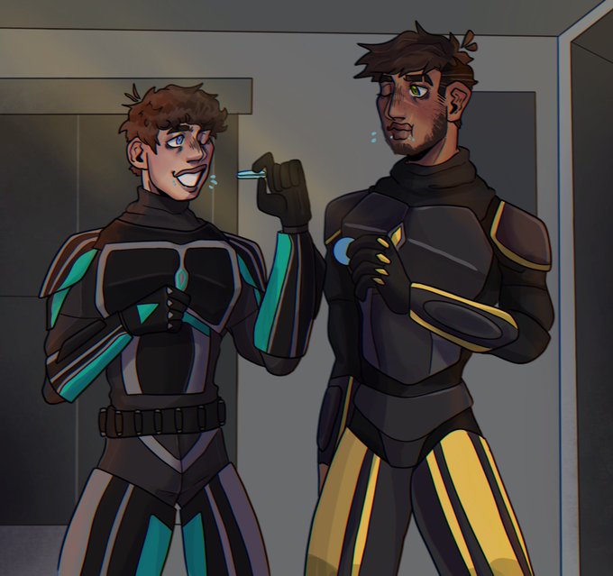 One w teal armor is Zhi (They/Them, and one w yellow is Kollu (He/Him) they're married,,,