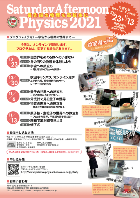 大阪大学理学研究科が主催する【最先端の物理を高校生に Saturday Afternoon Physics】のポスターができあがったようだ https://t.co/Z2KLTP7UZg