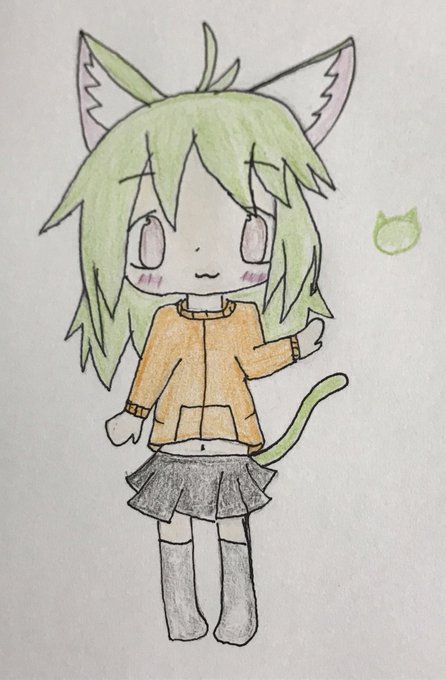 @GREENCAT3280 さん家の子描きましたぁ〜・・・少し失敗したところもあったけど描くの楽しかったです。猫耳で髪が黄緑色で可愛くて好きです〜!