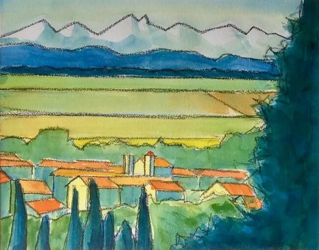 "Caunes-Minervois, Autumn" by Malcolm Croft - charcoal and watercolour