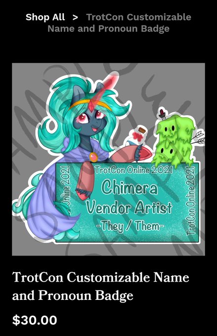 Good morning @TrotCon! Be sure to check out both my shop and my TeePublic store for designs as well as a CUSTOM NAME AND PRONOUN BADGE! 💜