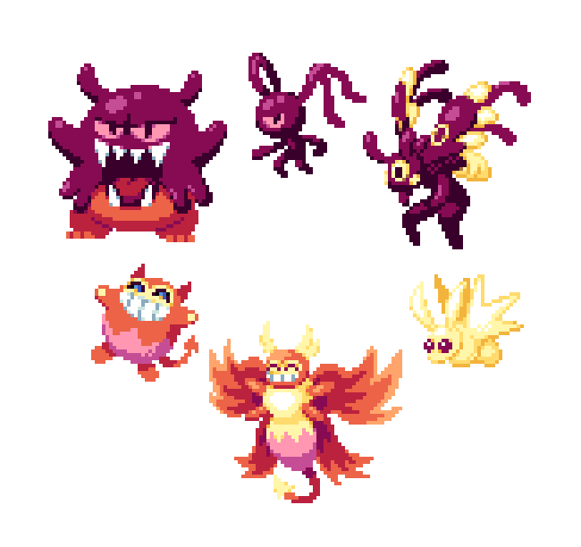 I've been screwing around with different art styles. Had an idea for a theoretical monster battle game where you fuse small monsters into big ones.