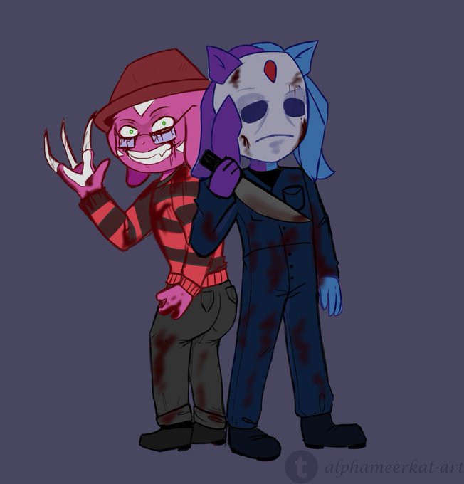 Here are some Dead by daylight themed pics, first one drawn by @nymphcathy and the second one by @MeerkatAlpha . Both of those with Void as Micheal Myers, as its my main. On the first one Gaze is as Ace Visconti, his survivor main and on the second one as Freddy, his killer main.