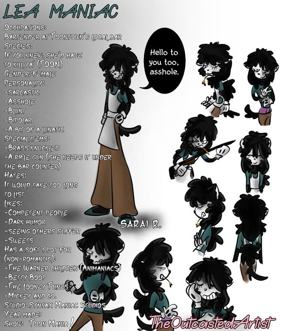 Also I forgot to put it on the drawing, but Lea Maniac was created in 1950 by Syntax Maniac Studios (not a real studio and completely made up by me) in the show "Toon Mania!" (A comic I'll make at some point in the future)