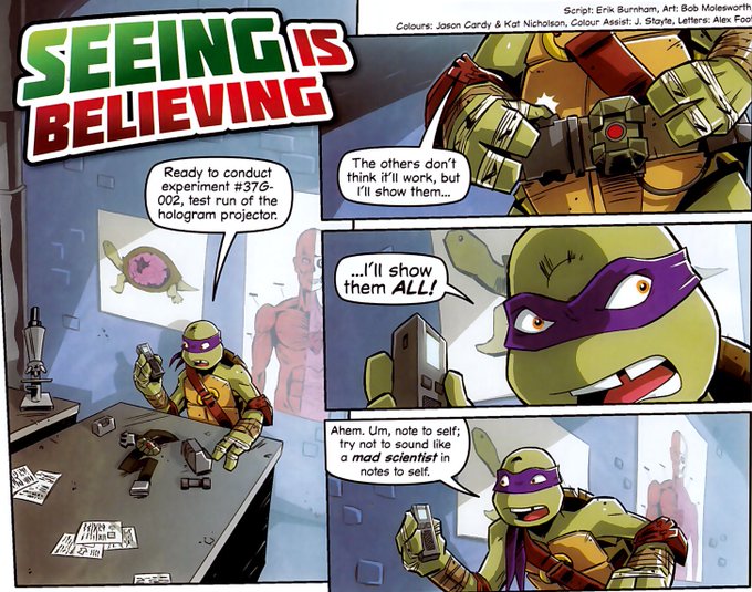 In this Panini comic, Donnie creates a device that serves as a hologram projector based on images from his t-phone sent through on wi-fi connections. When the device starts picking up different signals, things start getting a little complicated.