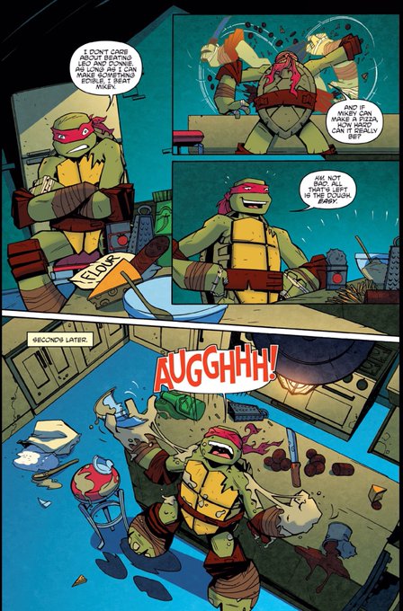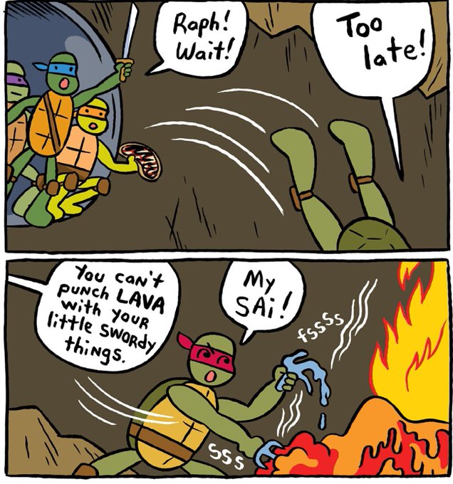 In this IDW comic, a volcano under the city threatens to blow up, and Mikey wants to make a volcano-fired pizza. Poor Raph melted his sai. :’(