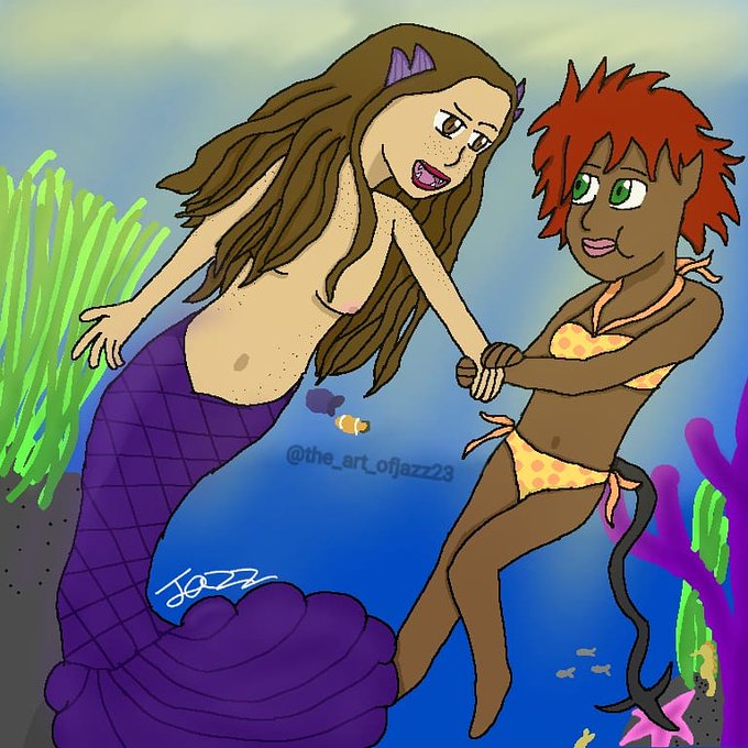 I decided to keep Opal as a demon (minus her usual horns). Meanwhile, Yue is a mermaid instead of a human being.
